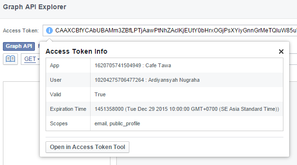Gambar 2  - Setelah itu klik simbol tanda seru warna biru, disamping kode token kamu, lalu klik Open in Access Token Tool. (Gambar 3)