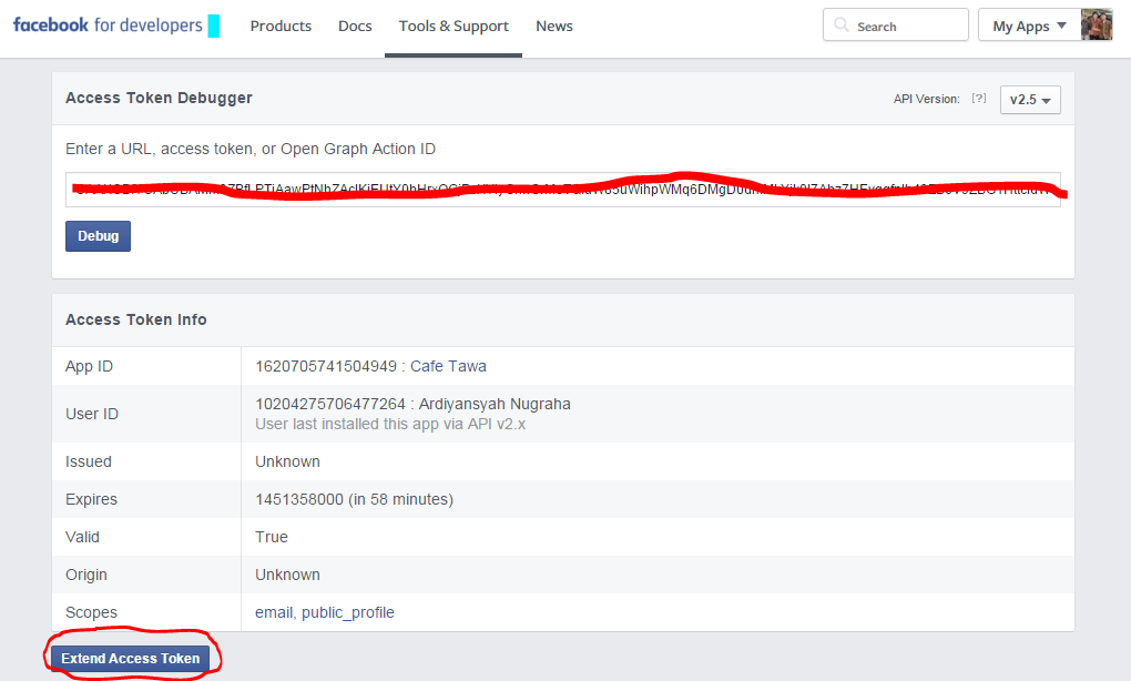 Gambar 3  - Maka akan muncul gambar seperti dibawah ini, lalu klik Extend Access Token (Gambar 4)