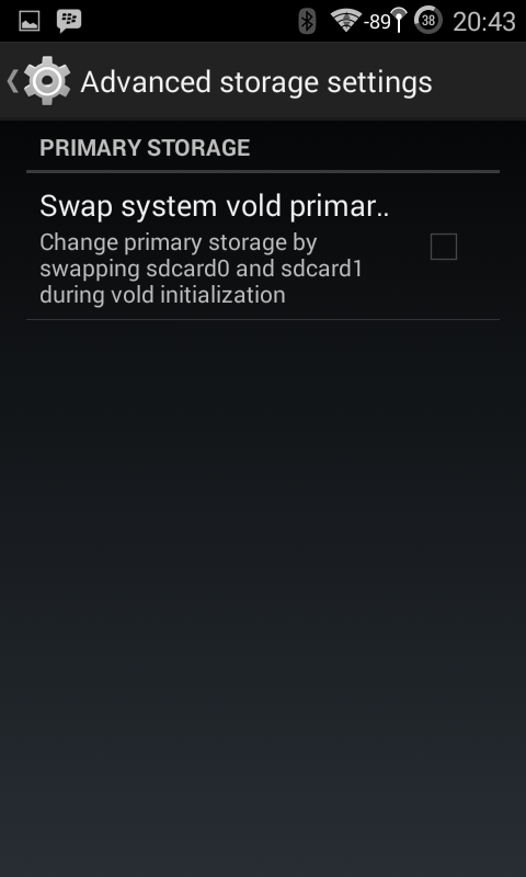 - Selanjutkan kita akan melakukan SWAP memori agar penyimpanan aplikasi dan data disimpan ke memori eksternal, caranya masuk ke setting > tekan tombol option pilih Advanced storage settings > checklist Swap system vold primary (lihat gambar 2).